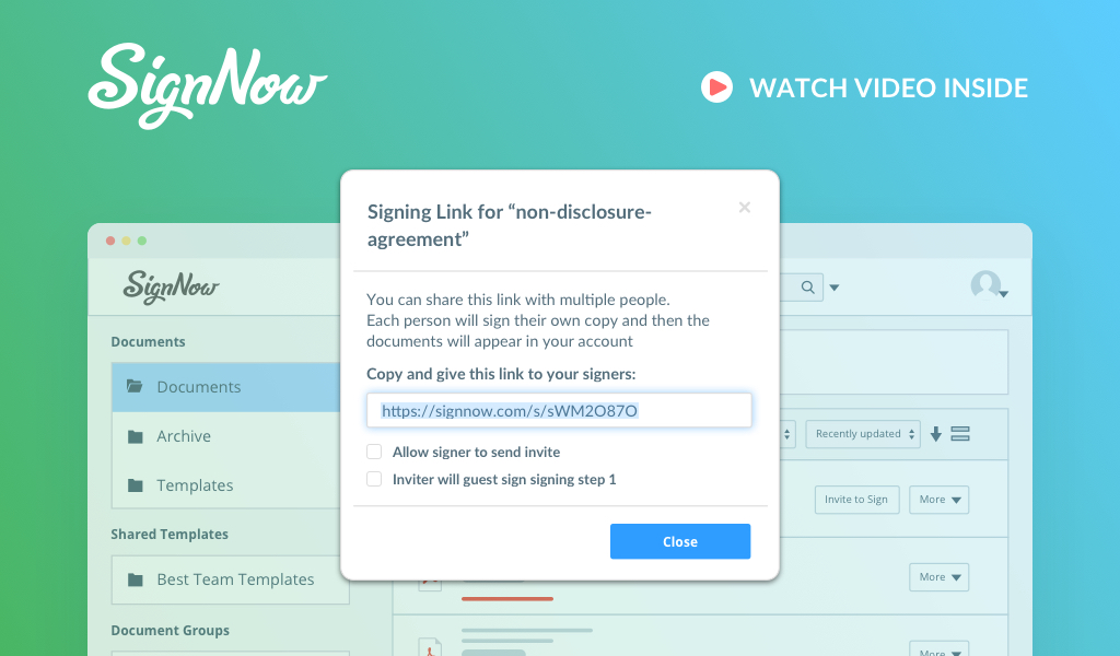 Productivity 7 things you can do with signNow besides eSigning signNow is an award-winning eSignature platform used by millions of customers to electronically sign, send, and manage documents on any device. However, its functionality isn’t limited to just that. ... Productivity The 3 most indispensable signNow features, according to our team ….aside from eSigning, of course. Working with signNow, using it, and writing about it, has naturally made us well-acquainted with the ins and outs of our product. By both ... Productivity Bulk send Sales documents for signing using signNow’s Team Templates How much time does your Sales team spend on closing deals? When customers have to print out a document, physically sign it, and then mail or fax it back ... Productivity Payment solutions for small businesses: How to collect payments using signNow Are delayed payments affecting your sales cycles? Delight your customers with fast and secure payments online right after signing documents. Allowing clients to pay online quickly eliminates delays and ... Productivity Top 4 benefits of using Kiosk Mode The Kiosk Mode feature in signNow allows you to have signers complete documents right in front of you on an iPad. This is beneficial for businesses that require clients ... Productivity signNow allows you to collect signatures by creating signing links If you’d like to share a document via a short link without having to add signer email addresses, use signNow to generate a unique URL and share it with ...
